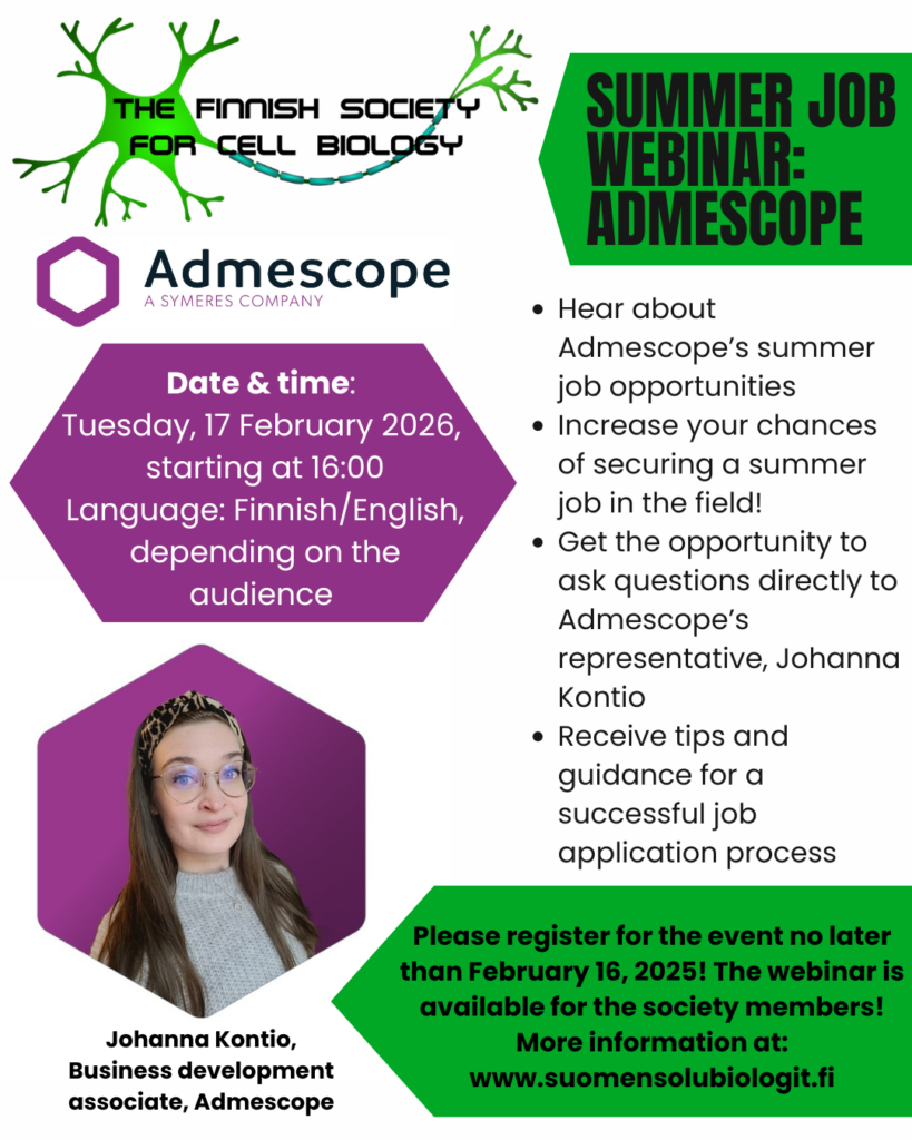 The Finnish Society for Cell Biology is organizing a summer job webinar series for its members! On 17.2.2025, we will hold Admescope summer job webinar, where we will hear about Admescope’s summer job opportunities. The speaker of the webinar will be Johanna Kontio (Business development associate, Admescope; a biomed alumni from the University of Eastern Finland, Kuopio).