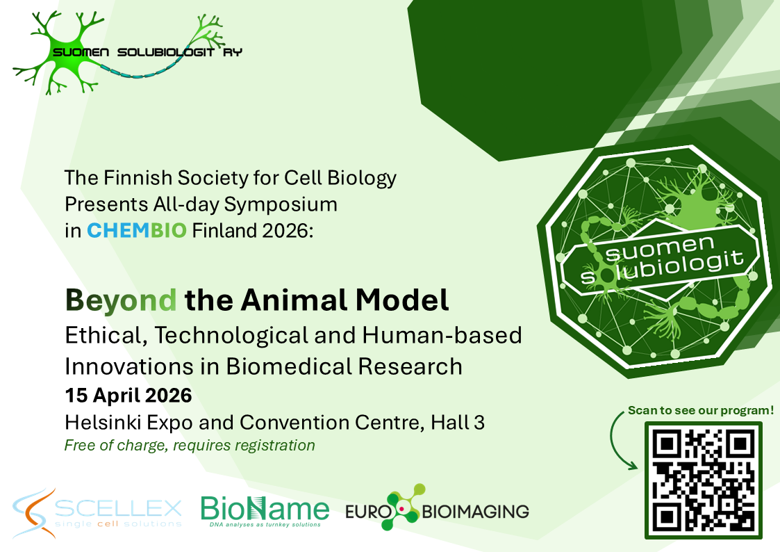 ChemBio Finland 2026 – the professional event for the chemistry and biosciences fields – will take over the Helsinki Expo and Convention Centre on April 15–16, 2026. The Finnish Society for Cell Biology will participate in the event for the first time by organizing a symposium on Wednesday, April 15, from 10:30 to 15:30 in room 3. The title of the symposium is ”Beyond the Animal Model: Ethical, Technological and Human-Based Innovations in Biomedical Research”.